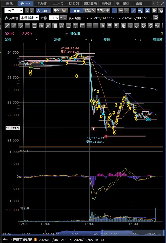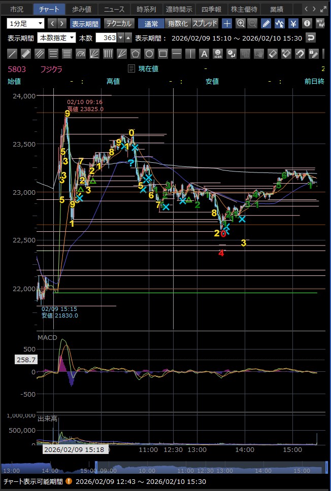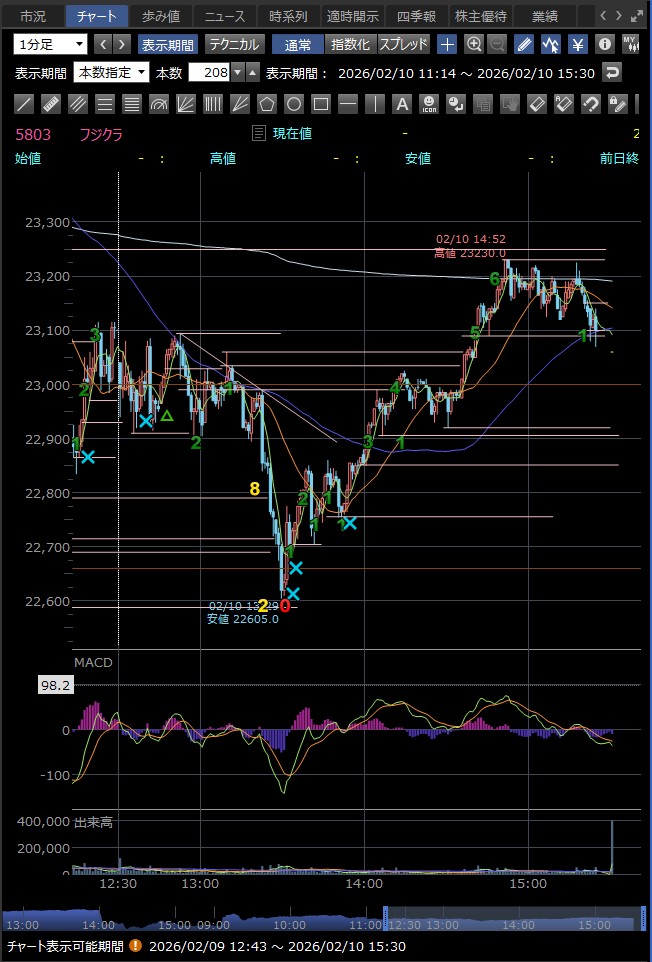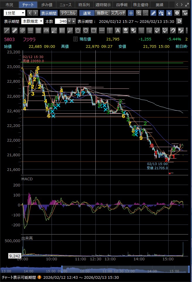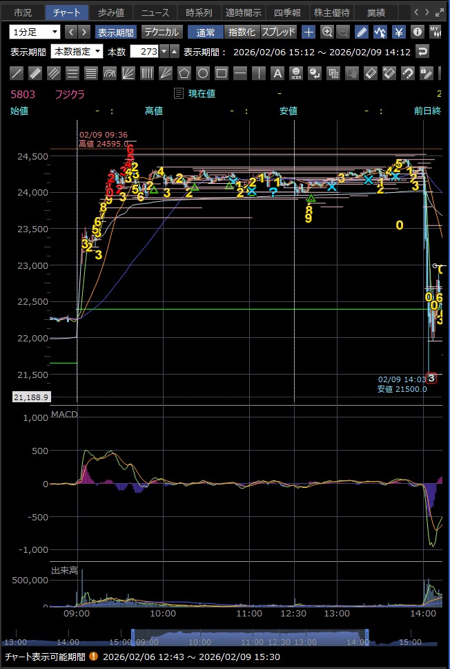 決算発表の14時に急落 好材料が既に株価に反映されており、決算発表後に利益確定売りが出て急落した — というのが2月9日のフジクラの後場の急落の主な理由のようだ 巻き込まれなくてよかった…><