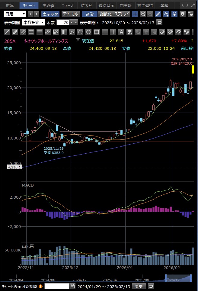 👉 政治材料で日経平均が上昇し、半導体もテーマ株として注目。ただし、米国テック懸念や利益確定で先高感一辺倒ではない流れ。