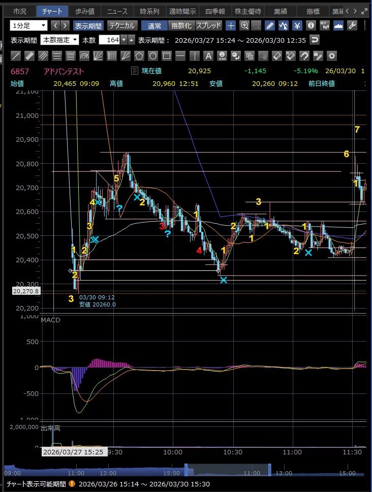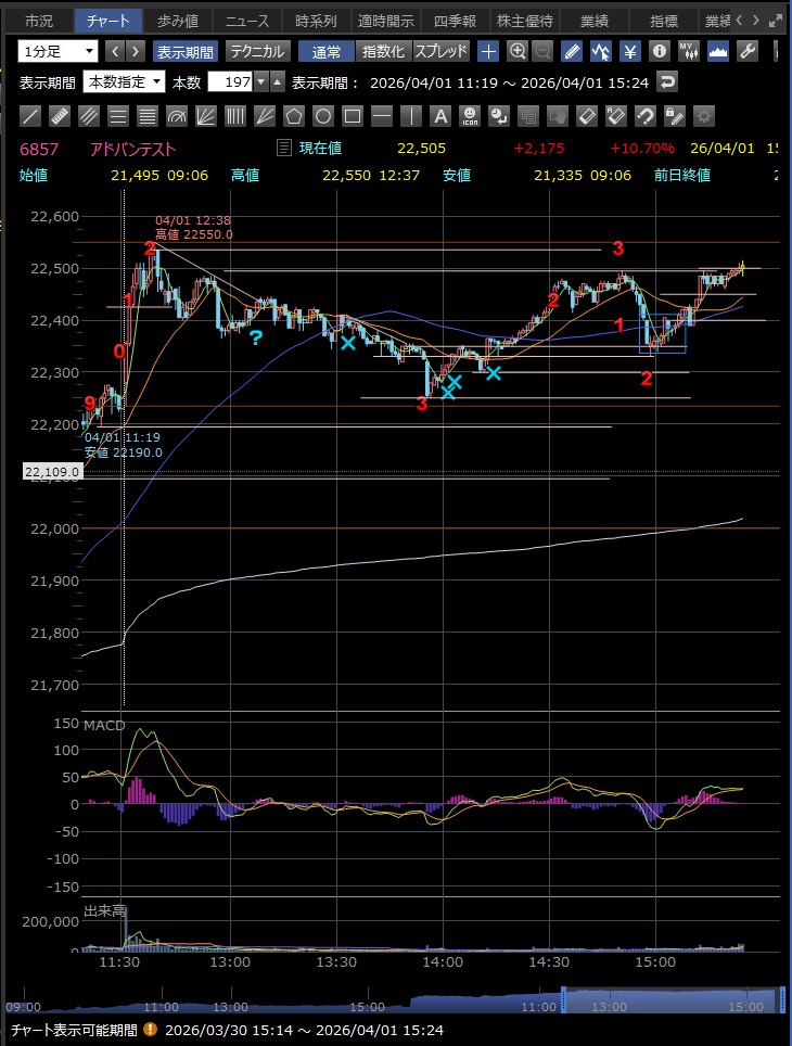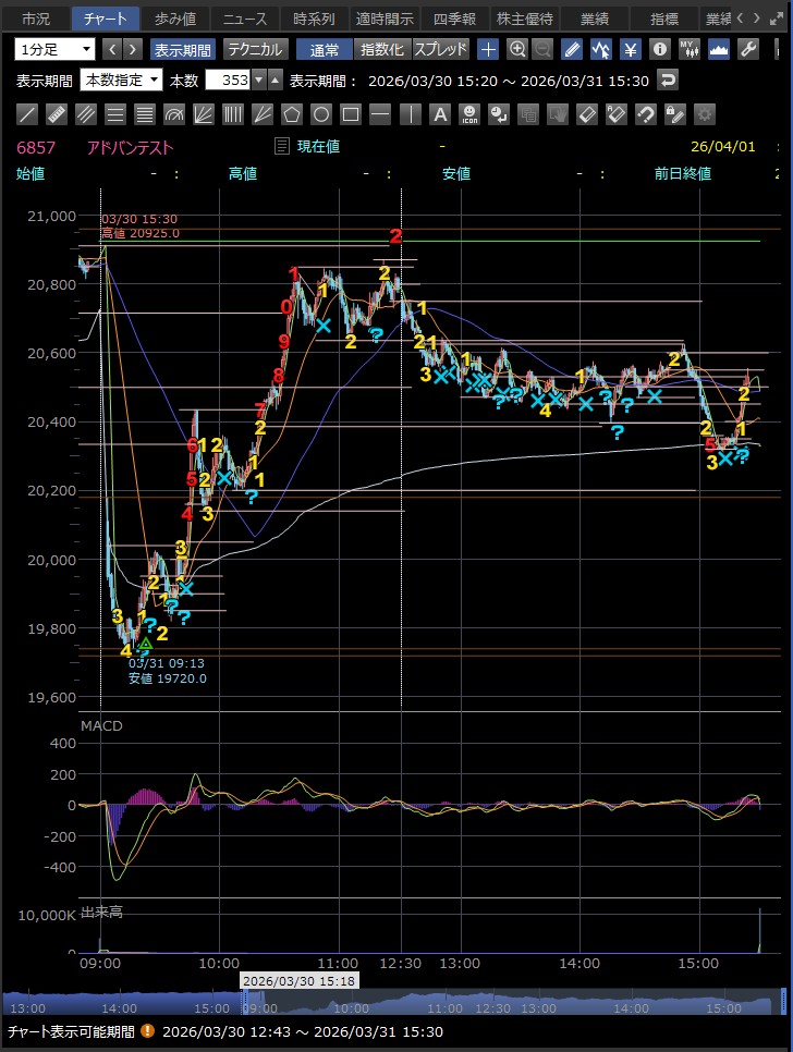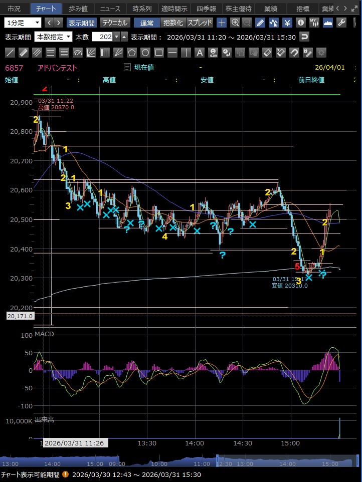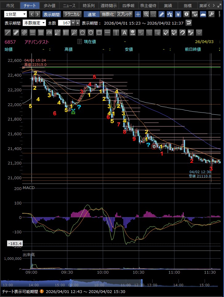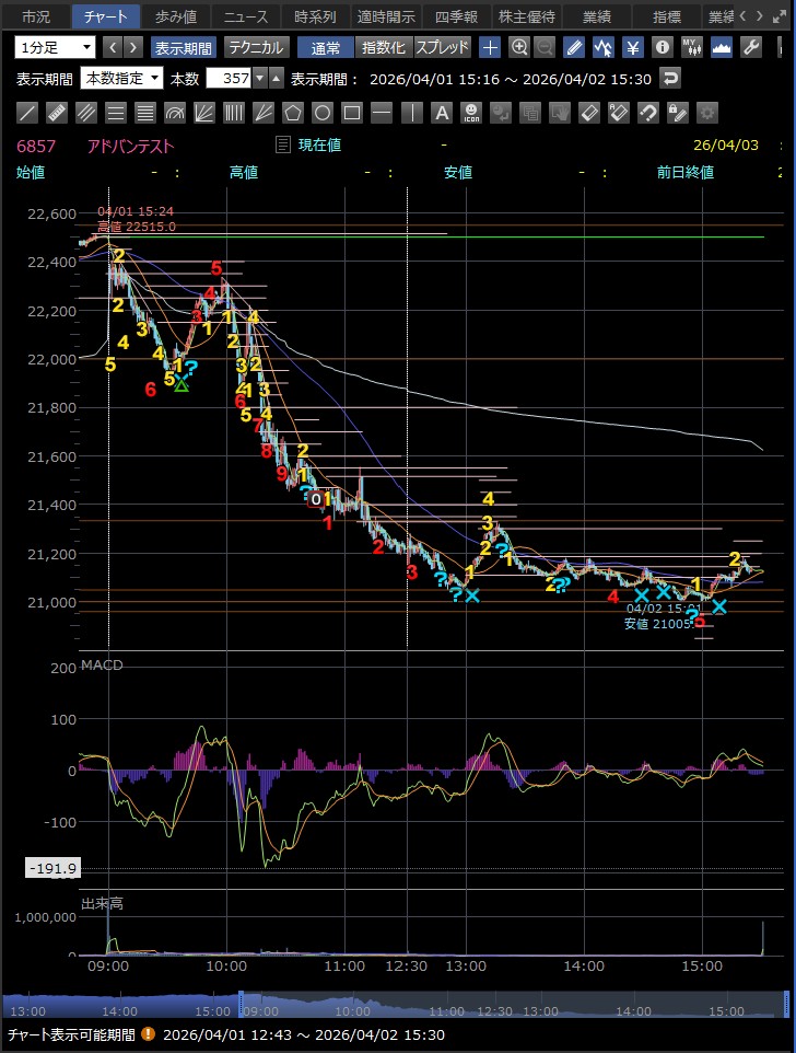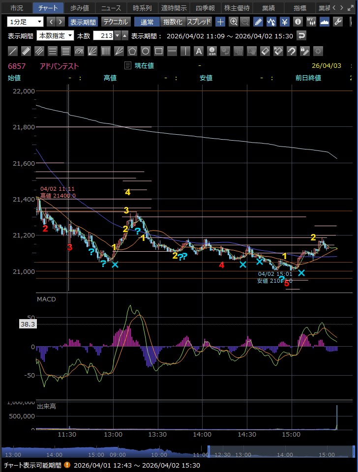 日中値幅 1,985円 前日の急反発の反動で、日経平均は高く始まったあと失速する寄り天気味の展開。朝方は一時 518円高 まで上昇したが、その後は利益確定売りに押されてマイナス圏へ転落。終値では反落し、値動きの荒い相場が続いた。