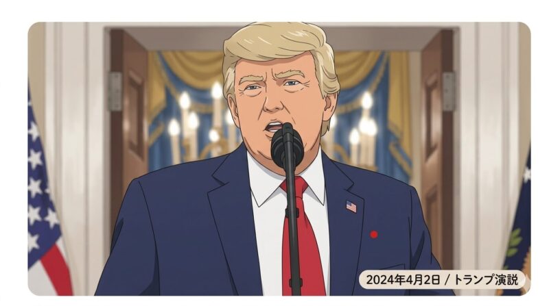 2026年4月2日(日本時間・午前10時)トランプ氏演説。対イラン強硬演説で停戦期待が後退し、原油急騰・リスク回避が強まり、日本株は地政学リスク警戒で上値の重い展開となった。