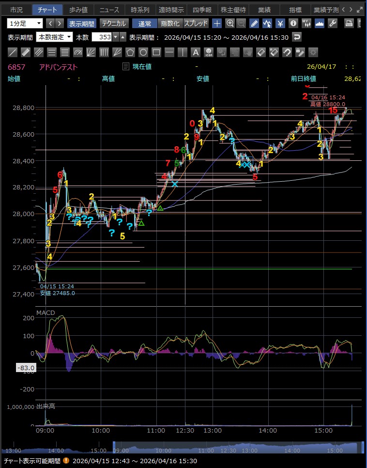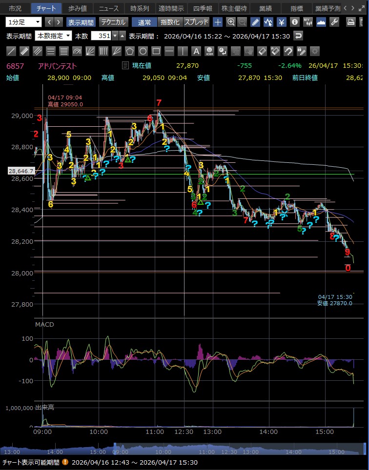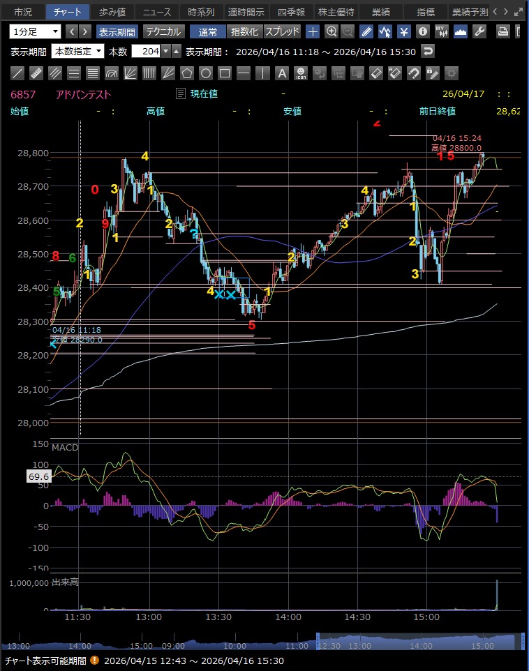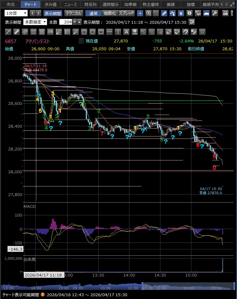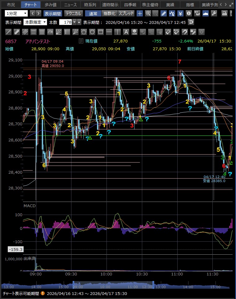 日中値幅 905円 高値から急落(利益確定売り)