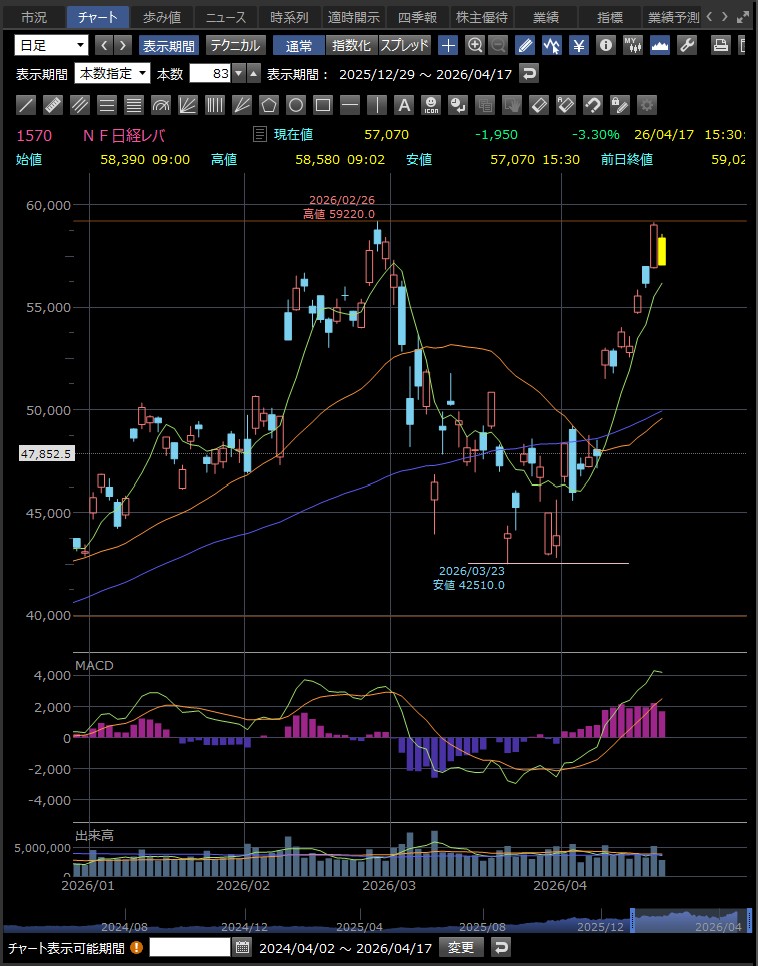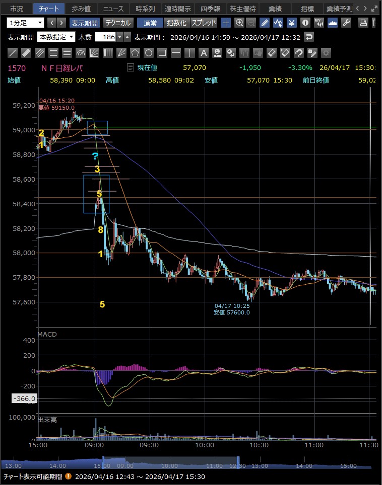 4/16終わり値59020買い 4/17寄付き58450損切
