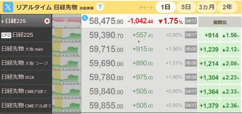 4/18日経先物CMEドル建が上昇 アメリカ市場も好調 WTI原油先物83.85と下がってる(2026/4/18現在)